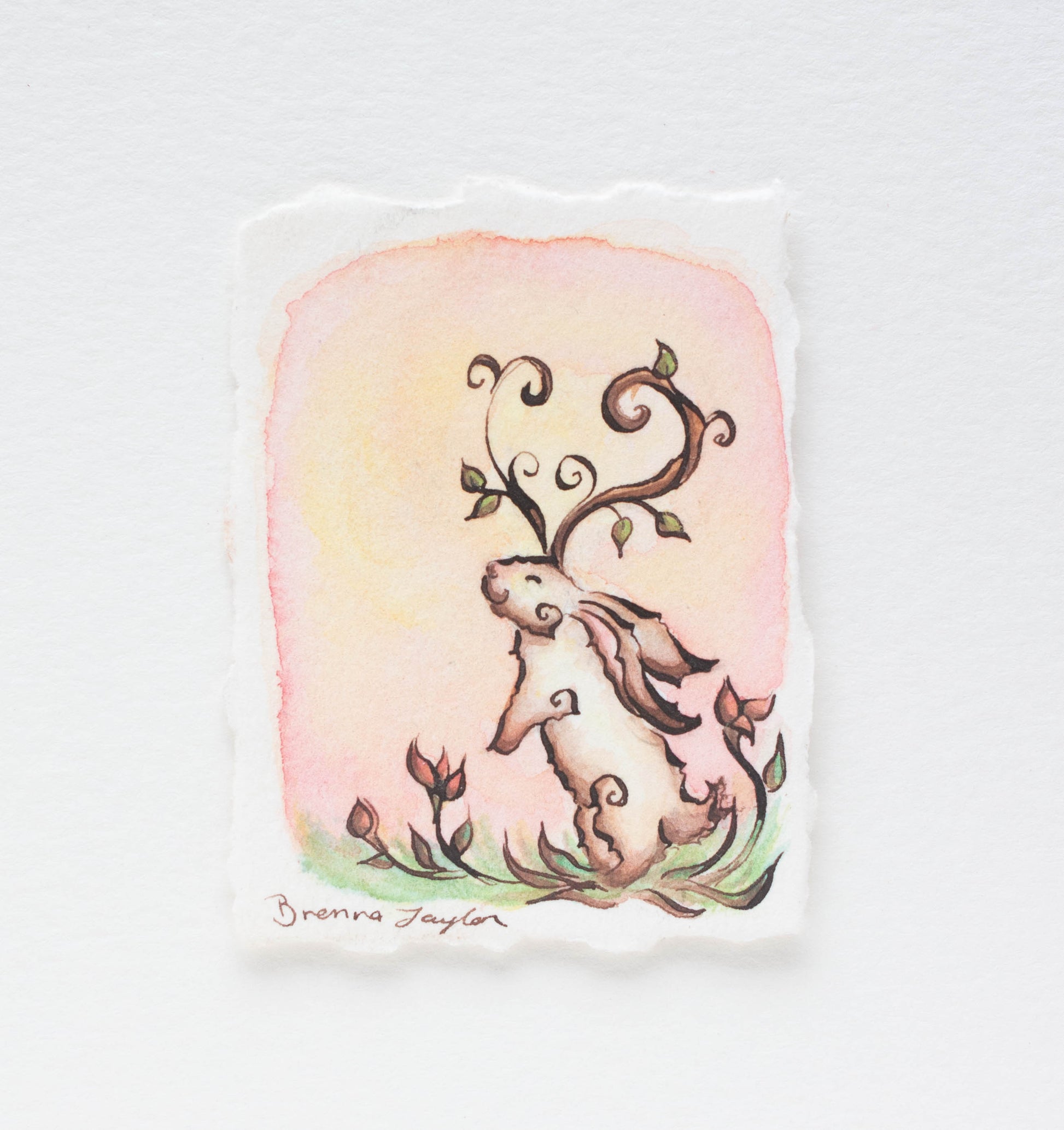 I have hand deckled this piece and gently mounted it with acid free artist tape onto white acid free, textured, 4x6 inch watercolor paper and matted it in mat measuring 5x7 inches on the outside. It's either ready to frame as is or easy to remove from the backing and mount or frame however you choose!