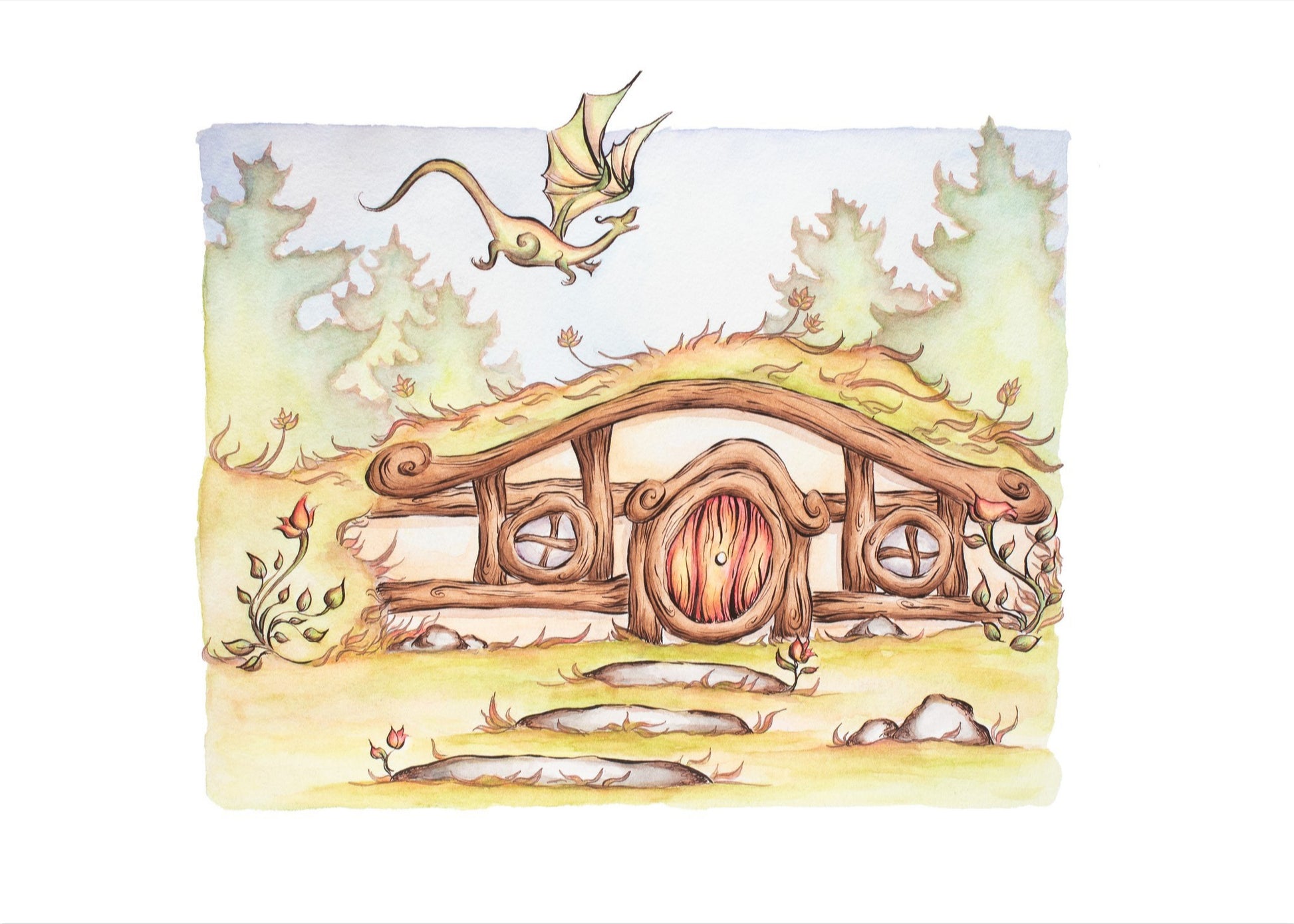 Fog, the dragon, is ready to enjoy elvenses meal with you in this cozy hobbit cottage!
