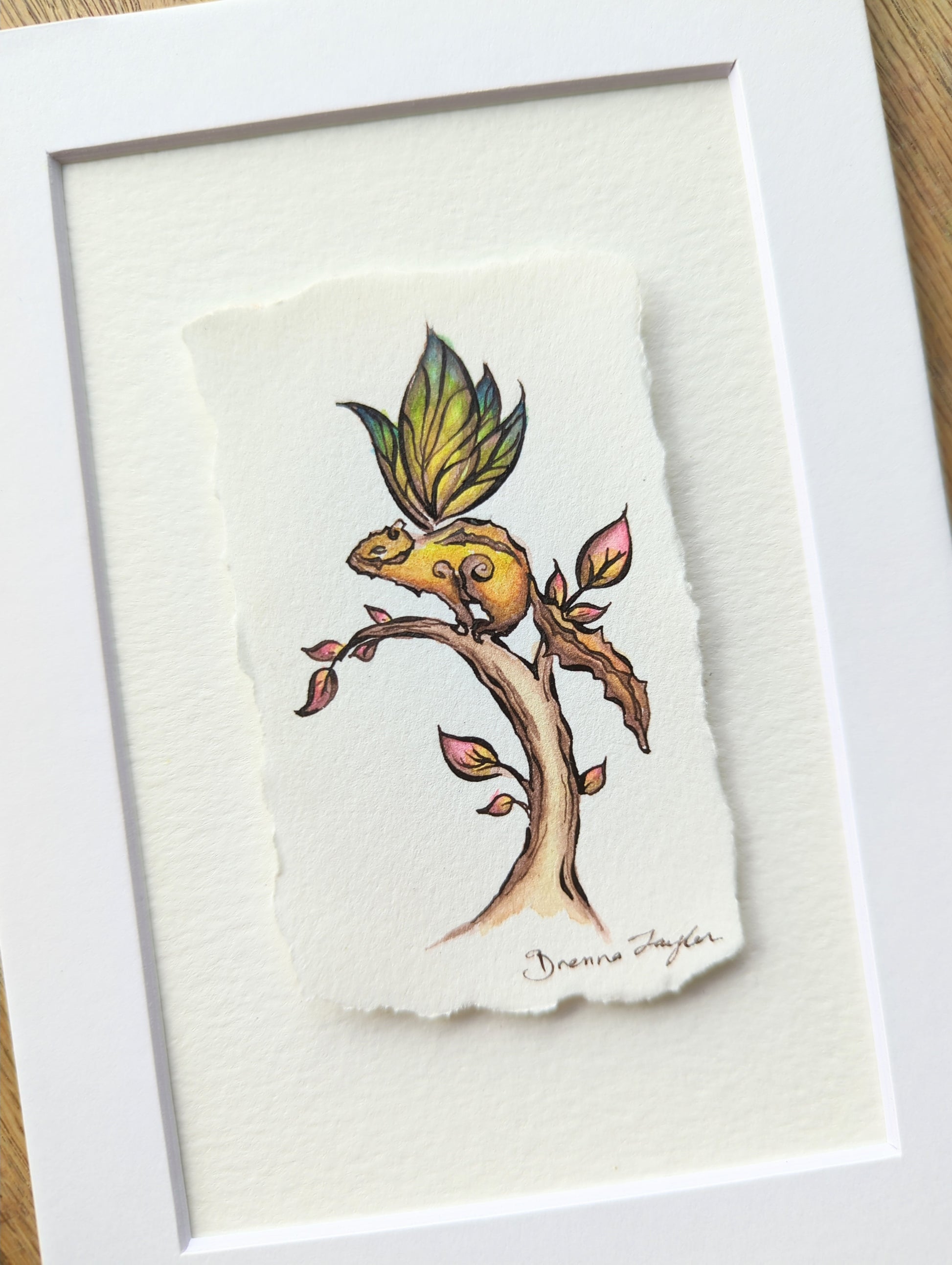I have hand deckled this piece and gently mounted it with acid free artist tape onto white acid free, textured, 4x6 inch watercolor paper and matted it in mat measuring 5x7 inches on the outside. It's either ready to frame as is or easy to remove from the backing and mount or frame however you choose!