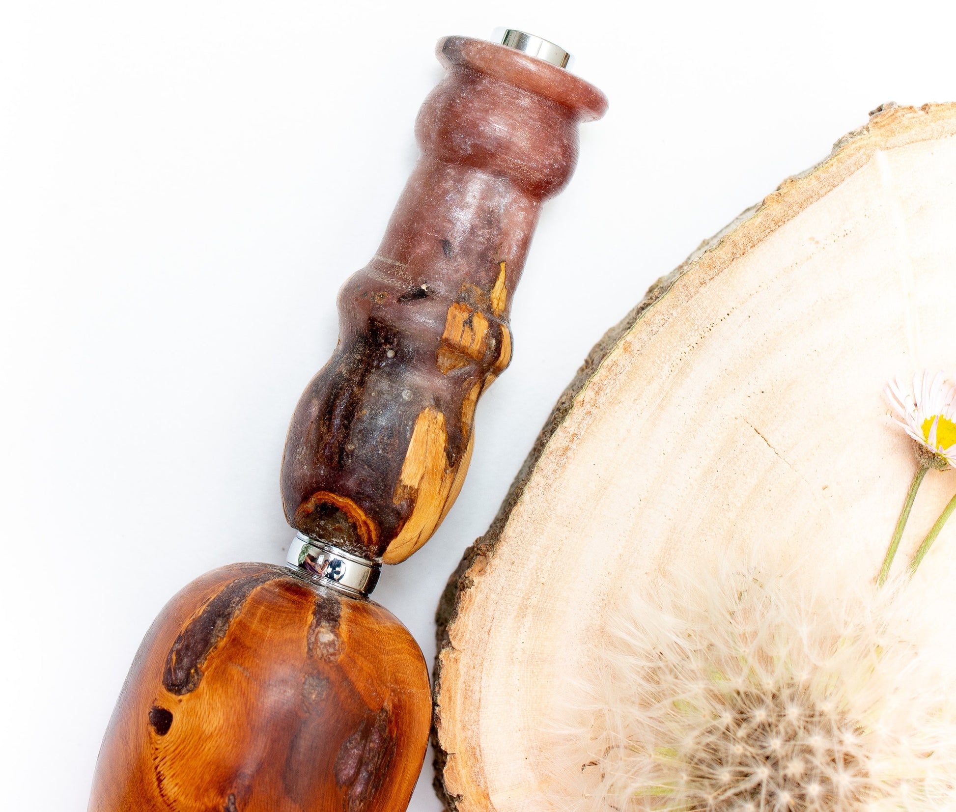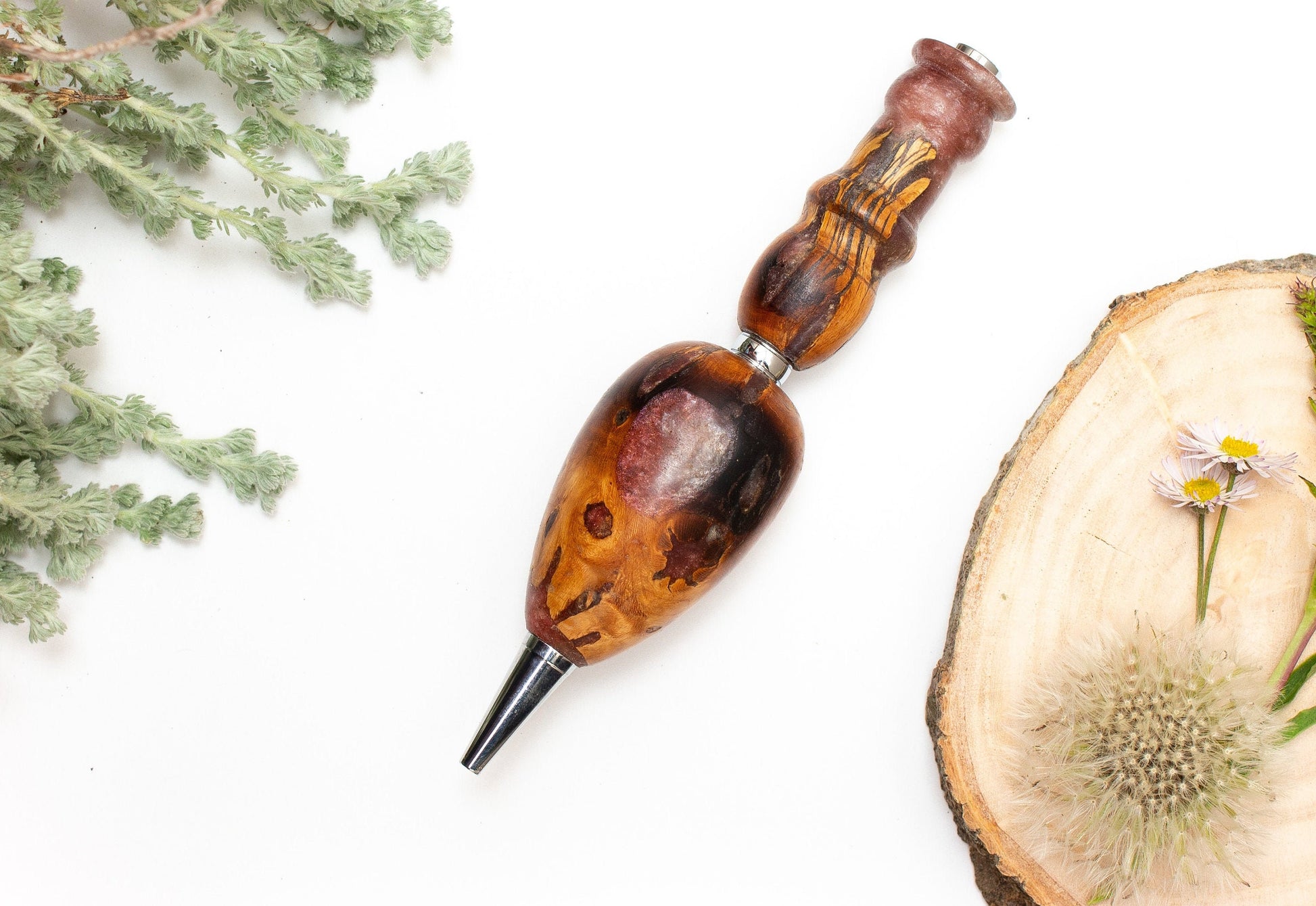 Most of our epoxy and wood hybrid pens are made from deadfall wood, wood that has died and fallen naturally. We collect the wood according to the rules, regulations and environmental recommendations of the area they are collected from. We also occasionally use wood leftover from yard or woodworking projects of kind neighbors.