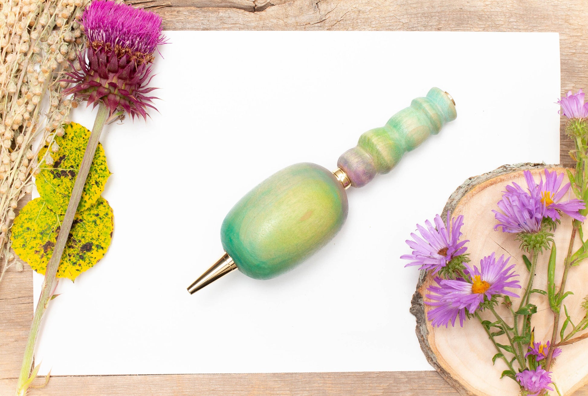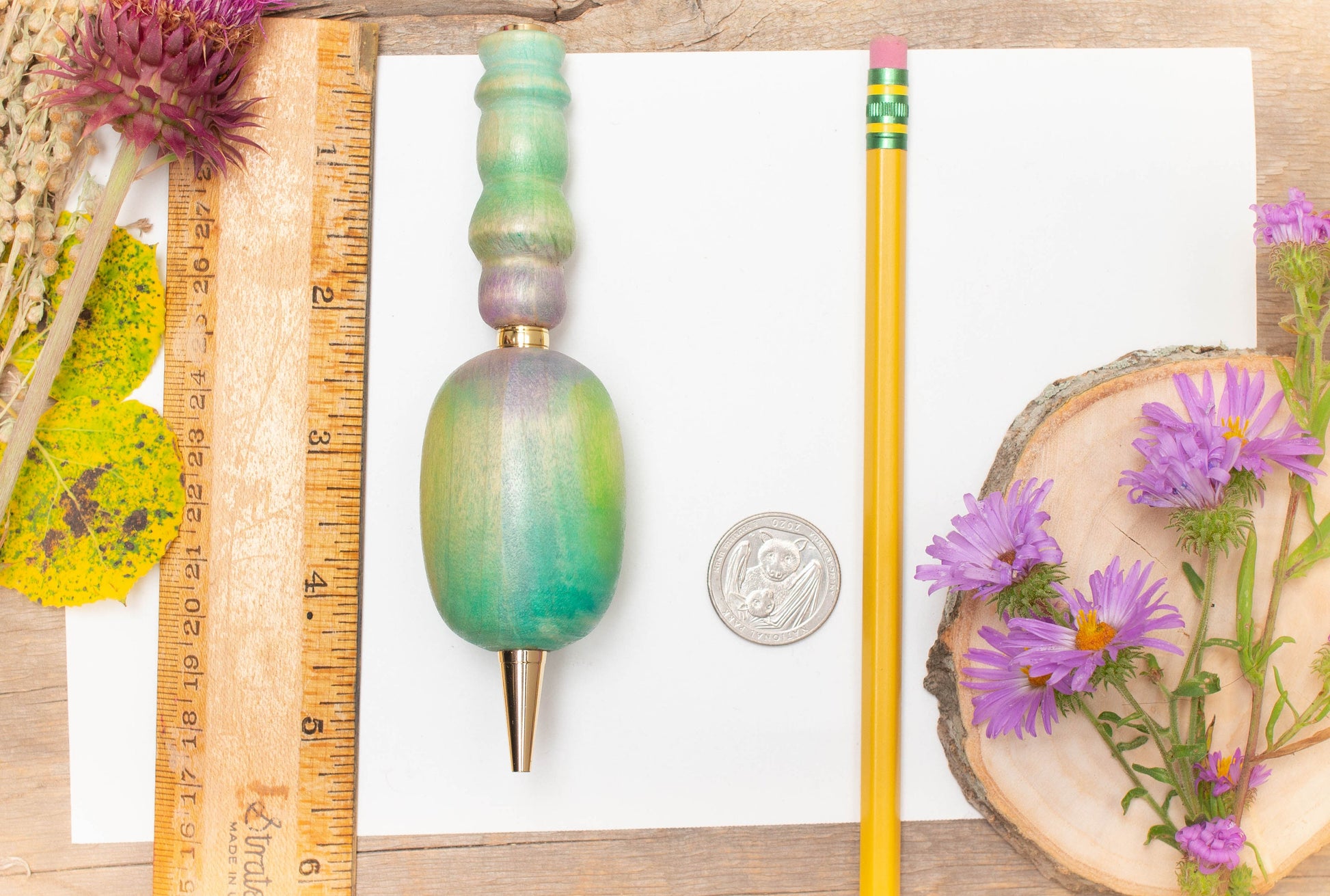 This also gives him the ability to make them any size that he wants, allowing him to turn larger grip writing instruments or handles so as to be comfortable to a greater diversity of people with different needs. We have discovered, from listening to family, friends and customers that a larger grip can be helpful for people with arthritis, carpal tunnel, Ehlers-Danlos syndrome, dysgraphia, and other physical or neurological conditions that make slimmer pens more difficult or painful to use. In our shop you can find a wide variety of pen and pencil sizes and shapes to choose from!