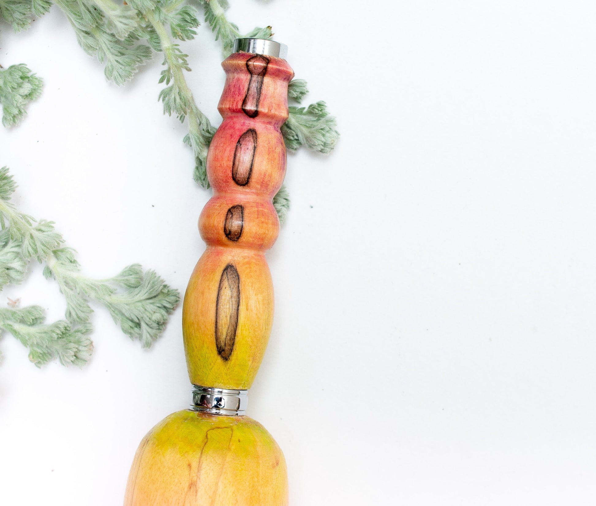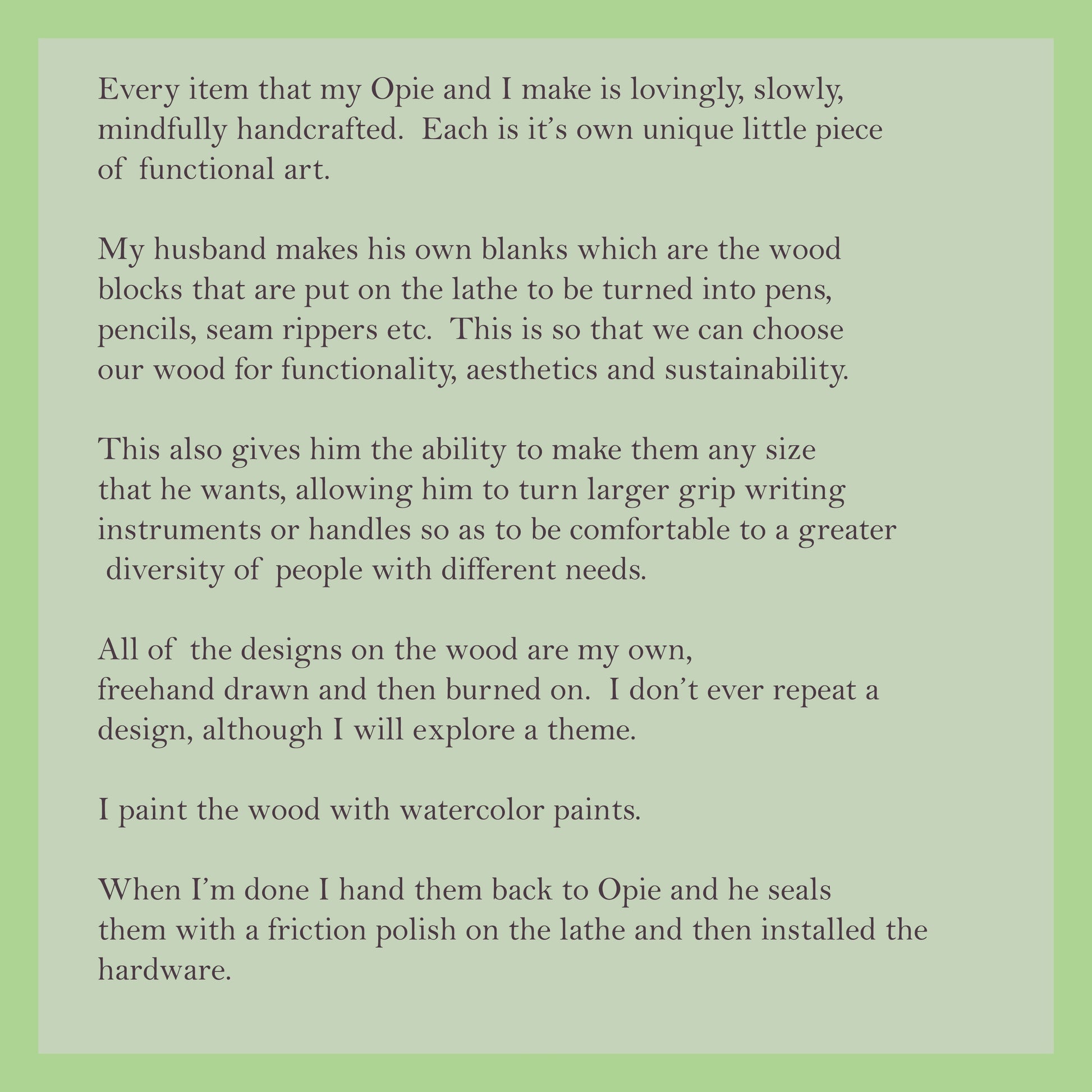 This also gives him the ability to make them any size that he wants, allowing him to turn larger grip writing instruments or handles so as to be comfortable to a greater diversity of people with different needs. We have discovered, from listening to family, friends and customers that a larger grip can be helpful for people with arthritis, carpal tunnel, Ehlers-Danlos syndrome, dysgraphia, and other physical or neurological conditions that make slimmer pens more difficult or painful to use. In our shop you can find a wide variety of pen and pencil sizes and shapes to choose from!