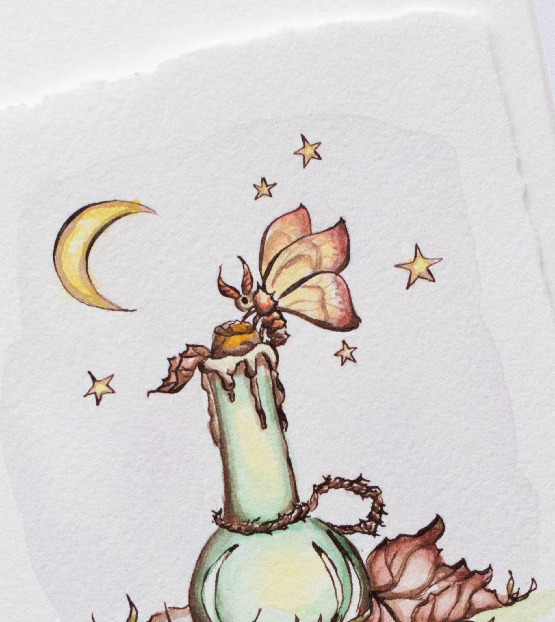This illustration is inked and painted in India ink and watercolor on 140lb(300g) cold press watercolor paper.