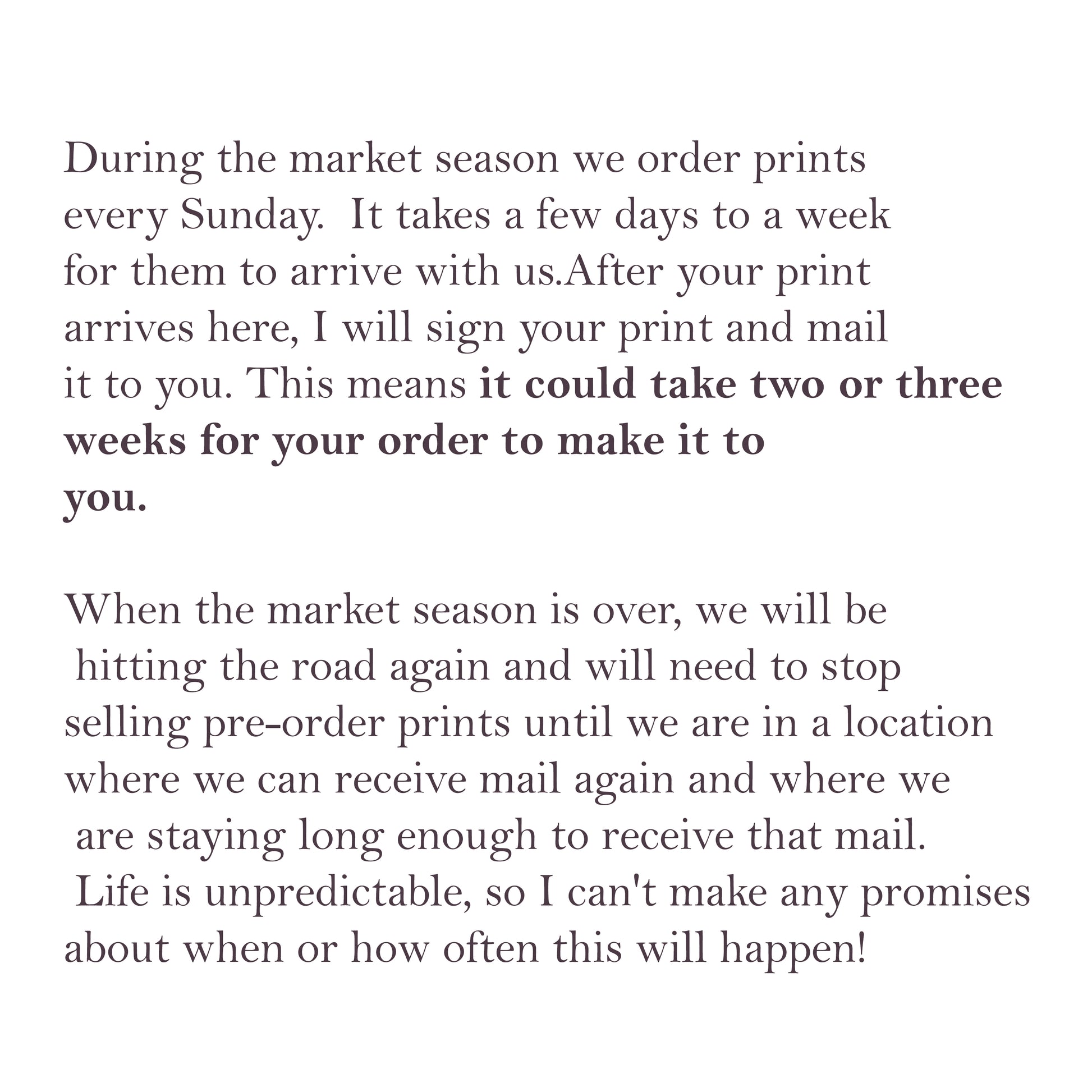 Pre-Order Prints are only available when we are parked somewhere that allows us to receive prints in the mail, so there will times when they are not available as we travel, and the listings will be turned off.