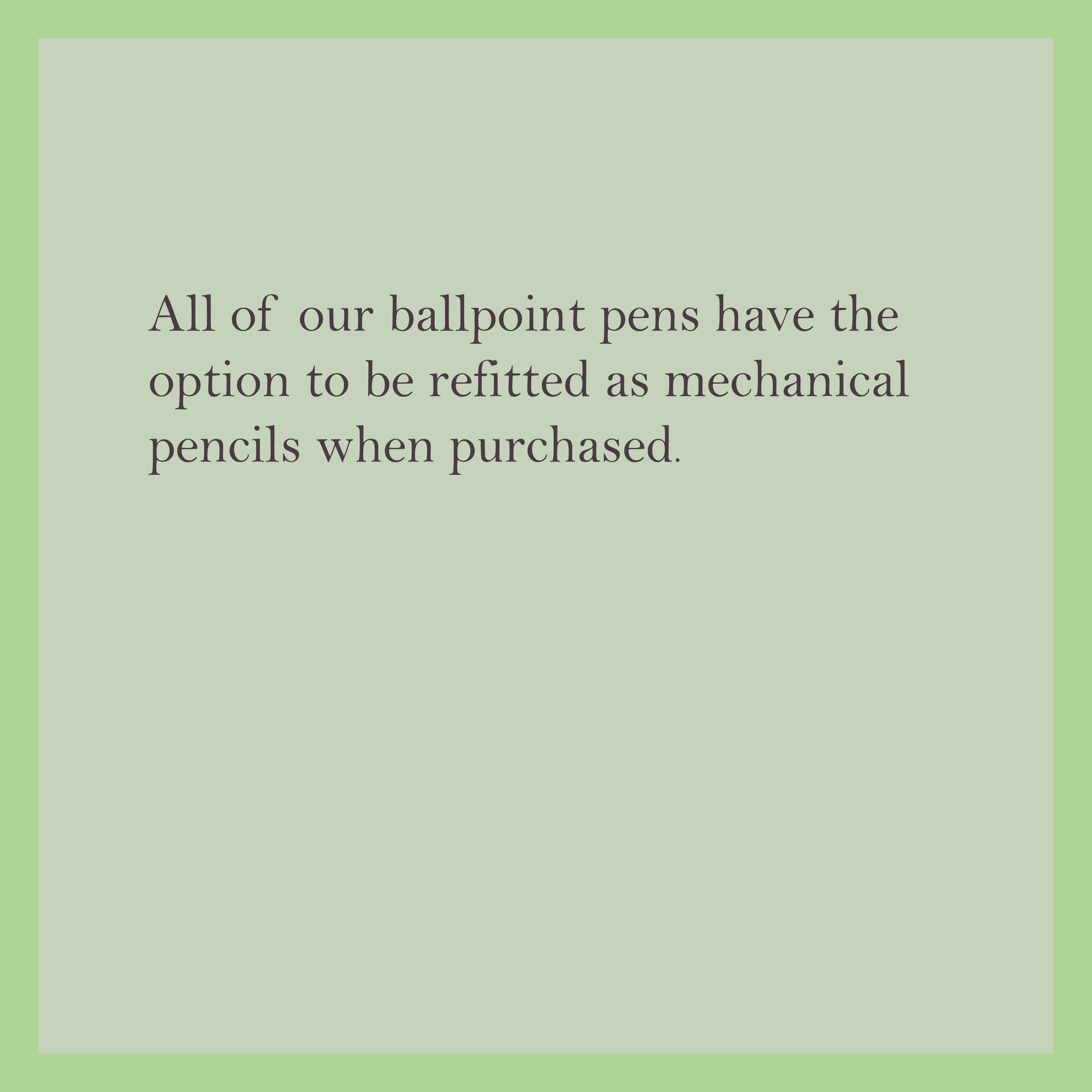 This wood ballpoint twist pen is hand turned by Opie in a larger grip meant to be more comfortable for people with joint, nerve or other conditions that make slim pens difficult or painful to use. As a pen this is refillable with Cross style ballpoint refills and it can also be purchased as a mechanical pencil and we will change out the hardware before sending it to you!
