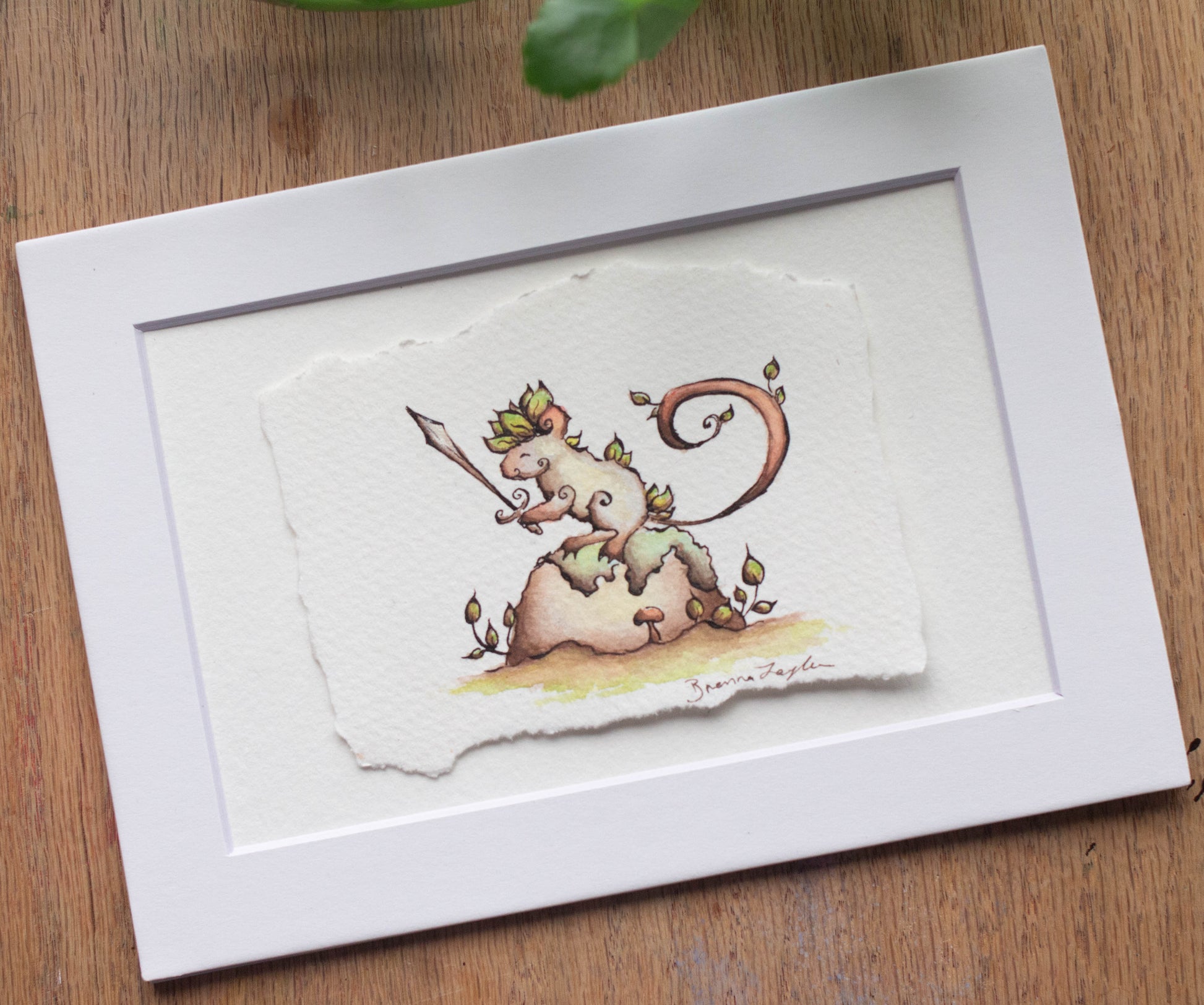 I have hand deckled this piece and gently mounted it with acid free artist tape onto white acid free, textured, 4x6 inch watercolor paper and matted it in mat measuring 5x7 inches on the outside. It's either ready to frame as is or easy to remove from the backing and mount or frame however you choose!